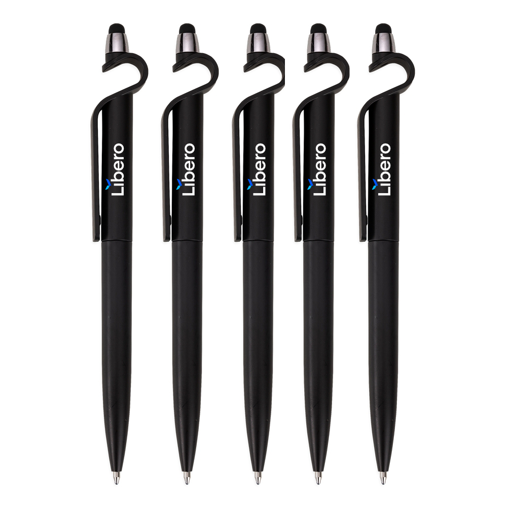 Caneta plástica com suporte para celular e touch screen. Carga esferográfica azul 1.0 mm e acionamento por rotação.